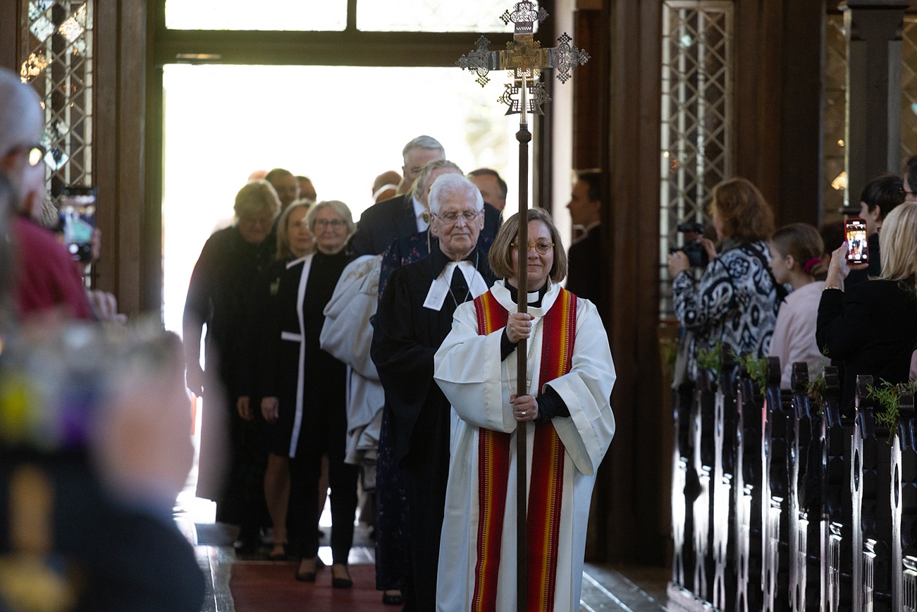 Dievkalpojuma sākuma gājiena priekšplānā jaunākā mācītāja Arta Skuja un vecākais mācītājs — prāvests emer. Dr. Juris Cālītis