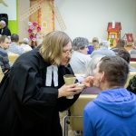 Uz plkst. 14 centra lielajā zālē bija sapulcējušies ap simts tā klientu un četri garīdznieki vadīja vienkāršotu dievkalpojumu ar dievgaldu visiem klātesošajiem, kas to vēlējās. Pēc nelielas pauzes garīdznieki sadalījās kopā ar centra darbiniekiem un apstaigāja tās nodaļas, kurās ir mazkustīgie klienti.